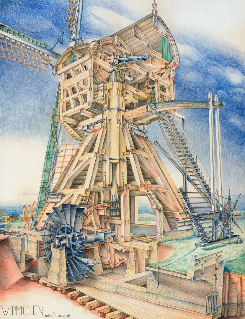 De molen langs de A2 tussen Utrecht en Amsterdam is een wipmolen uit 1644. Sinds die tijd maalt de molen dapper het water uit de Oukoper polder naar een hoger gelegen boezem. Zo houden de mensen in deze polder droge voeten. Deze iconische landmark wordt ons eerste technische model: we bouwen alle technische functionaliteiten na. Dat betekent dat de model bij voldoende wind echt water uit je vijver (of je badkuip) omhoog gaat pompen, en dat jij als molenaar het wiekenkruis en het bovenhuis geheel op de wind kunt zetten. Het model wordt circa 24 cm hoog — met de wieken erbij 46 cm.